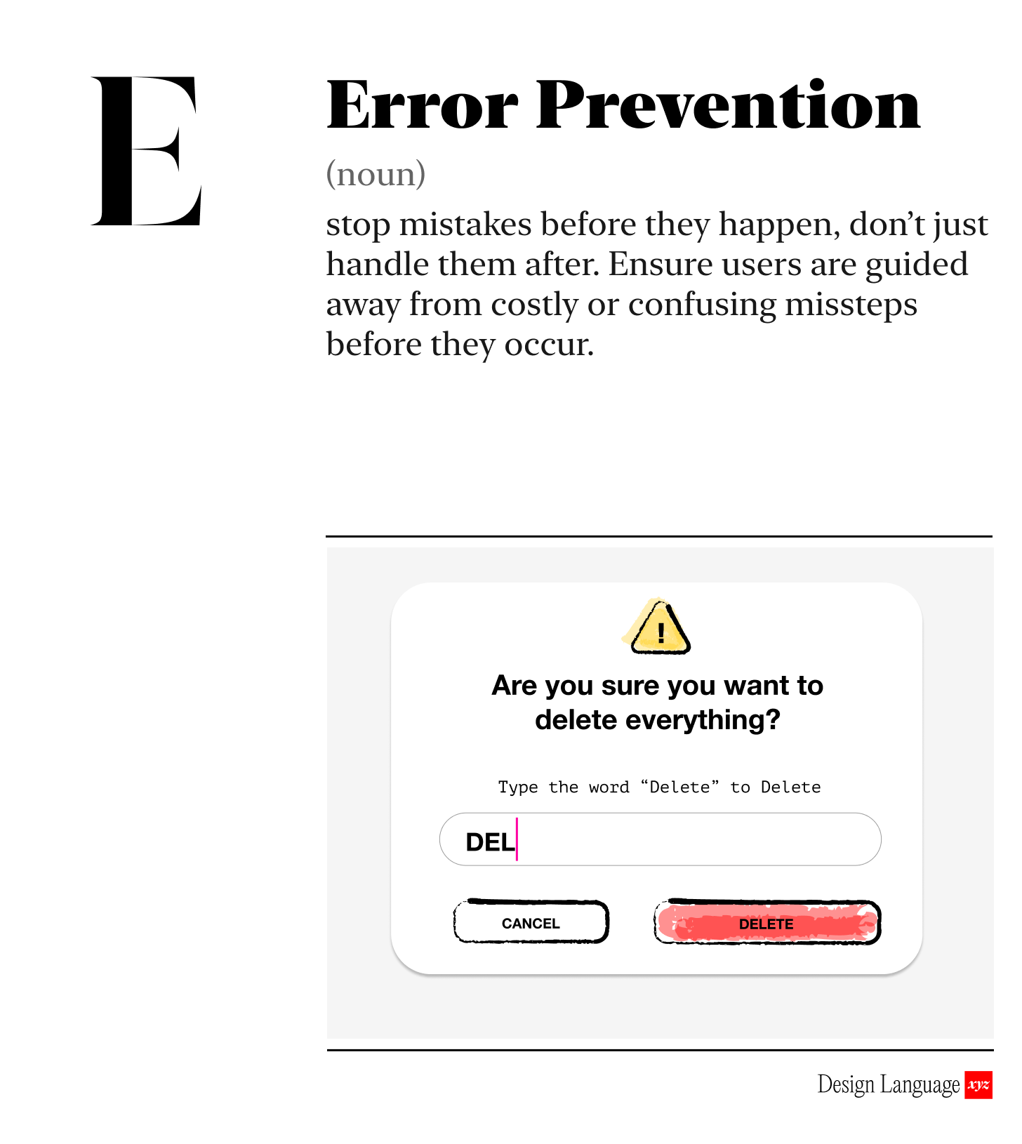 While you want to prevent errors, not all errors are created equal. Making a typo is different than deleting a critical record. Error preventions can add friction, so make sure the tradeoff is worth it. Potential big mistakes should have big interventions. Little mistakes need little interventions.