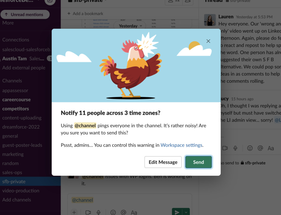 Slack uses confirmation popups mid-workflow. For example, when using the “@channel” command, it a warning pop-up is delivered to ensure you intend to notify everyone in every timezone.