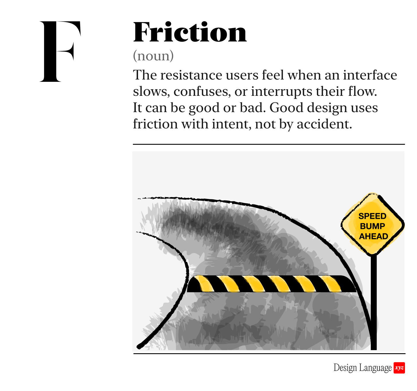 Friction is the resistance users feel when an interface slows, confuses, or interrupts their flow. It can be physical (more clicks), cognitive (hard to understand), or emotional (annoying).